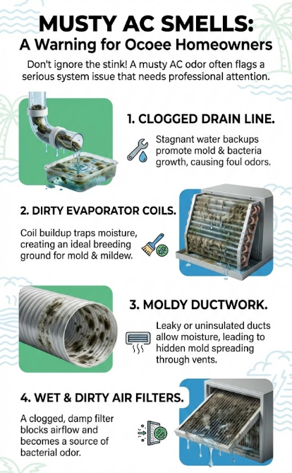 Musty AC smells signal moisture problems that won't self-resolve. Clogged drain lines, dirty coils, and ductwork condensation worsen without intervention—especially in Ocoee's humidity.